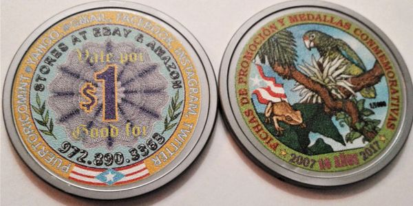 DIVERSOS TAMAÑOS DESDE MAS PEQUEÑA QUE UNA MONEDA 25c A MAS GRANDE QUE UN DOLAR MORGAN EN PLATA, PUEDE SER LISA A 1 COLOR CON TINTA A OTRO COLOR, O LISA MULTICOLORES, O A RELIEVE A UN COLOR, SIMILAR A UNA MONEDA (EMBOSED)
